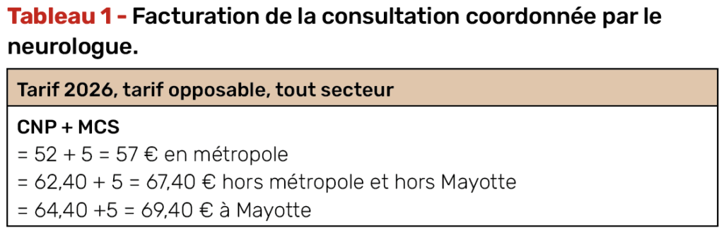À la consultation de référence (voir Neurologies 283) est associée une majoration de coordination. Elle est appliquée uniquement pour les médecins en secteur 1 et secteur OPTAM (option pratique tarifaire maitrisée) opposables ou secteur 2 non OPTAM appliquant les tarifs opposables.