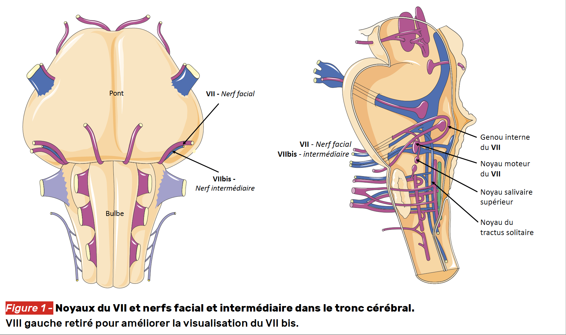 Comme pour le trijumeau, l’organisation nucléaire du VII repose sur un ensemble coordonné de noyaux distribués dans le pont et la jonction bulbo-pontique.