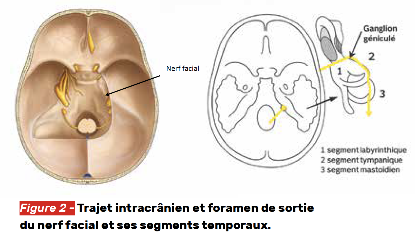 2. le segment tympanique : le nerf longe la caisse du tympan, ce qui explique les paralysies faciales d’otites et mastoïdites ;