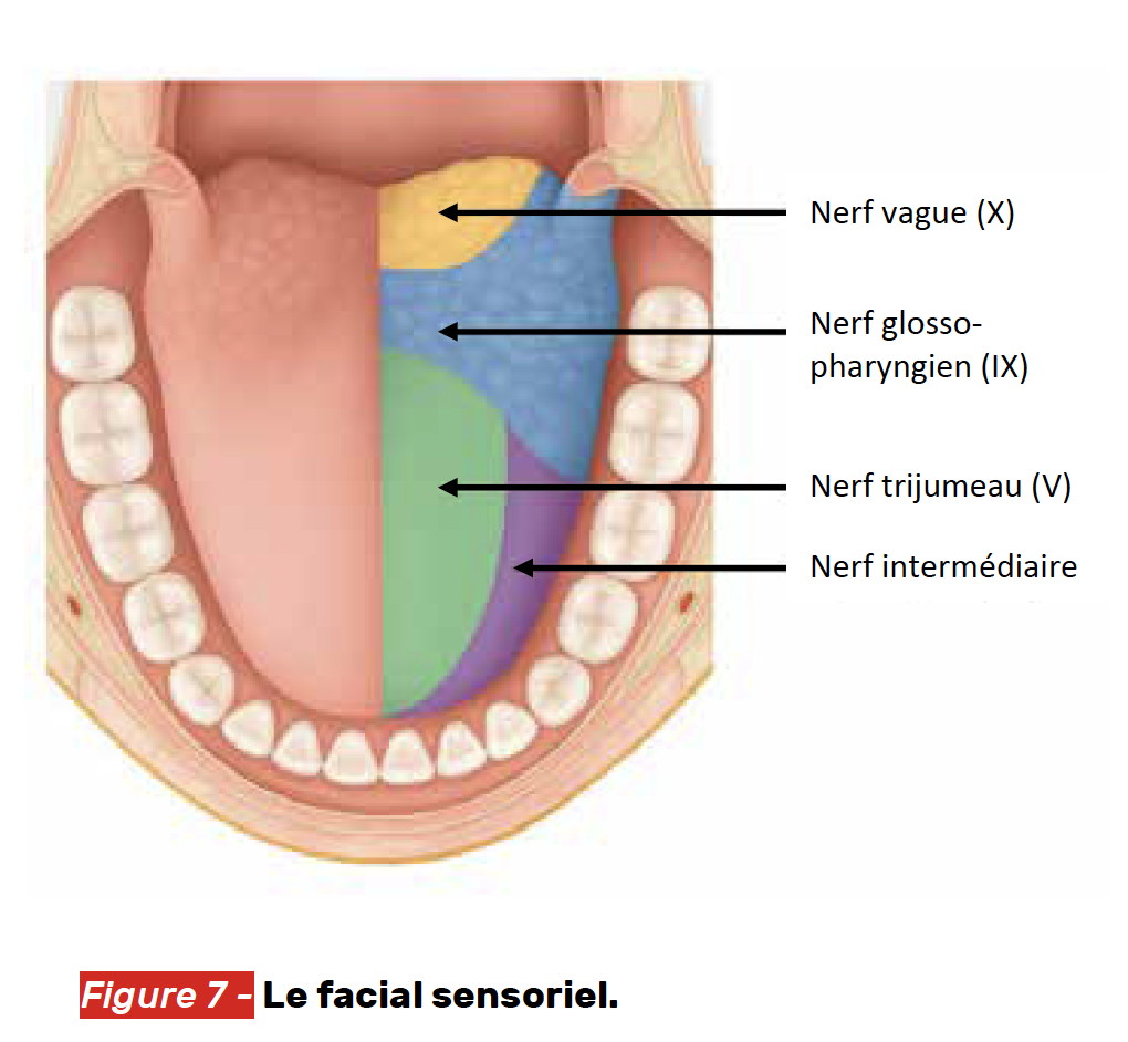 Le nerf facial intervient dans la perception gustative grâce à la corde du tympan, qui véhicule les fibres sensorielles issues des bourgeons gustatifs des deux tiers antérieurs de la langue.