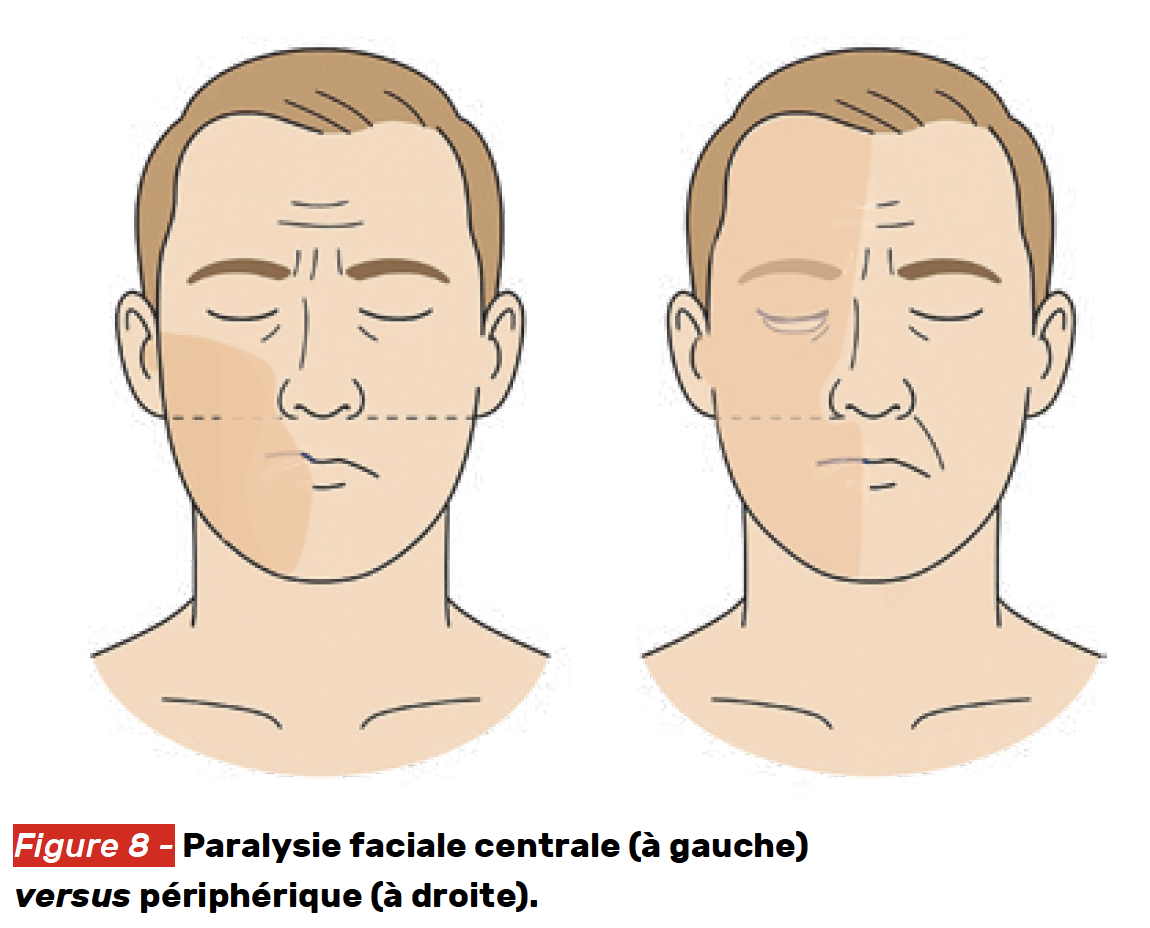 Le front est épargné, car le noyau facial supérieur reçoit une double innervation corticale. Cause principale : AVC.