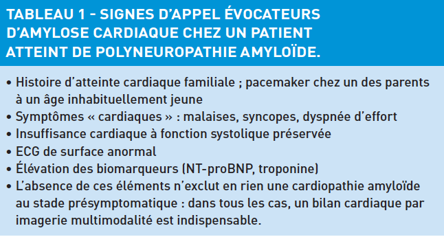 Au total, la fréquence et la gravité des atteintes cardiaques, leur caractère latent et asymptomatique ainsi que la fréquence des formes mixtes justifient un bilan cardiaque systématique complet chez tout patient diagnostiqué comme atteint de neuropathie amyloïde à TTR. La mise en évidence d’une amylose cardiaque pourra conforter un diagnostic étiologique de neuropathie amyloïde incertain et sera un élément déterminant du pronostic et de la décision thérapeutique.