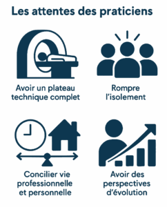À ce frein matériel s’ajoute la crainte de l’isolement professionnel. Environ deux tiers des répondants évoquent le manque d’échanges entre pairs, l’absence de réunions de concertation et la solitude dans la prise de décision. Les contraintes de garde, jugées parfois disproportionnées, et le manque de perspectives d’évolution — notamment en recherche et en enseignement — sont également cités comme des obstacles importants.