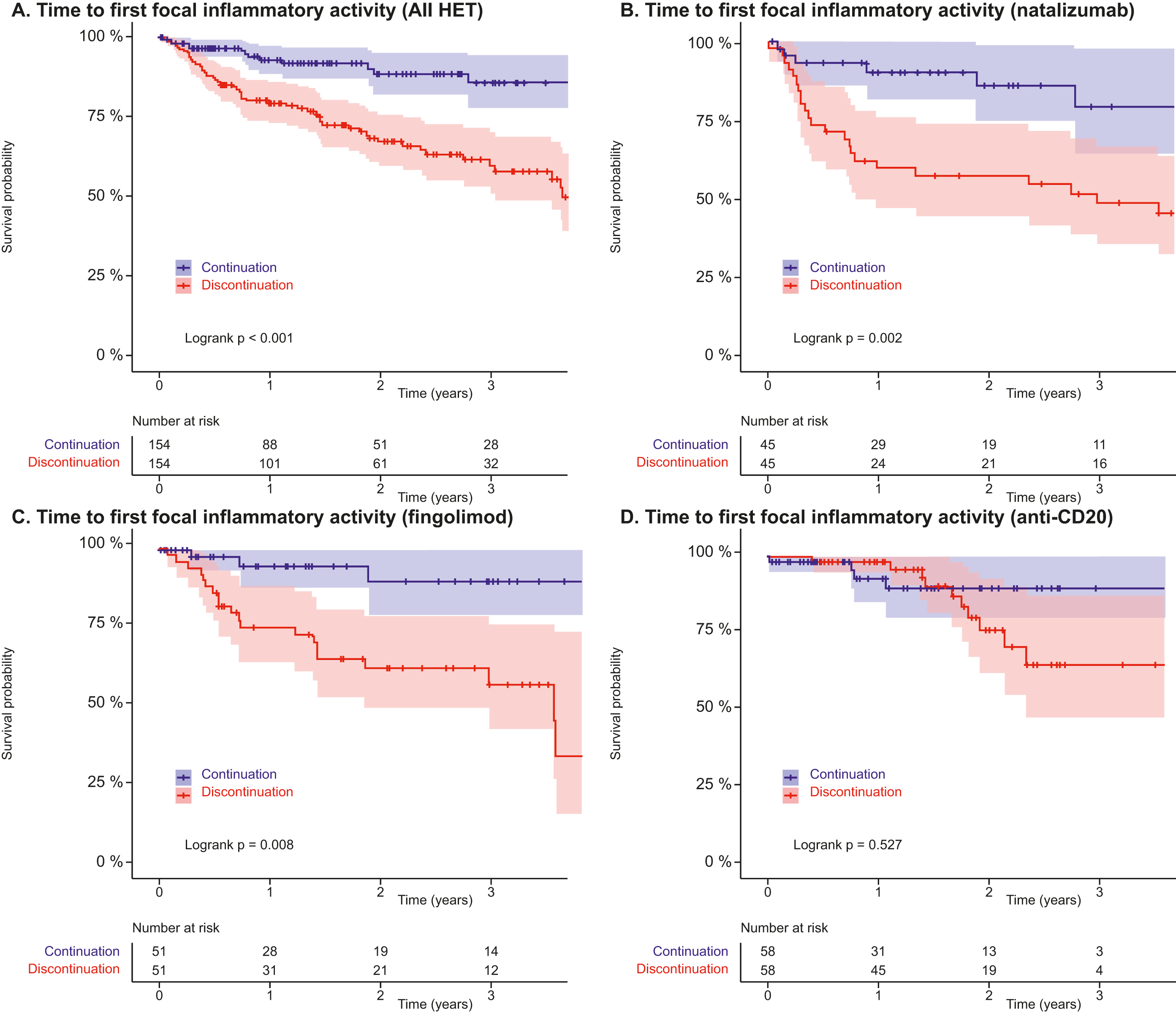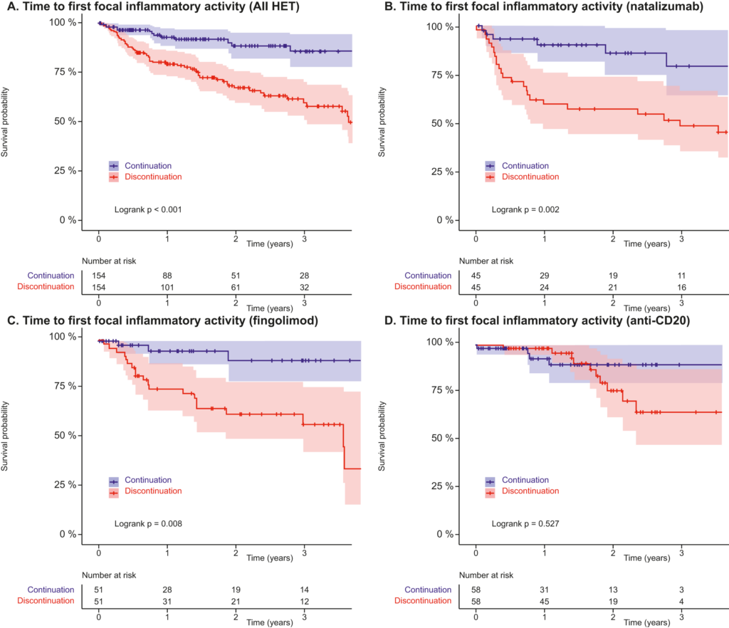 Figure 1 – Courbes de Kaplan Meier illustrant le risque de reprise d’activité inflammatoire (poussée ou nouvelles lésions IRM) dans le groupe qui continue ou arrête le traitement de haute efficacité suivant qu’il s’agisse de toute la population (A), des patients traités par natalizumab (B), des patients traités par fingolimod (C) ou des patients traités par anti-CD20 (D).
